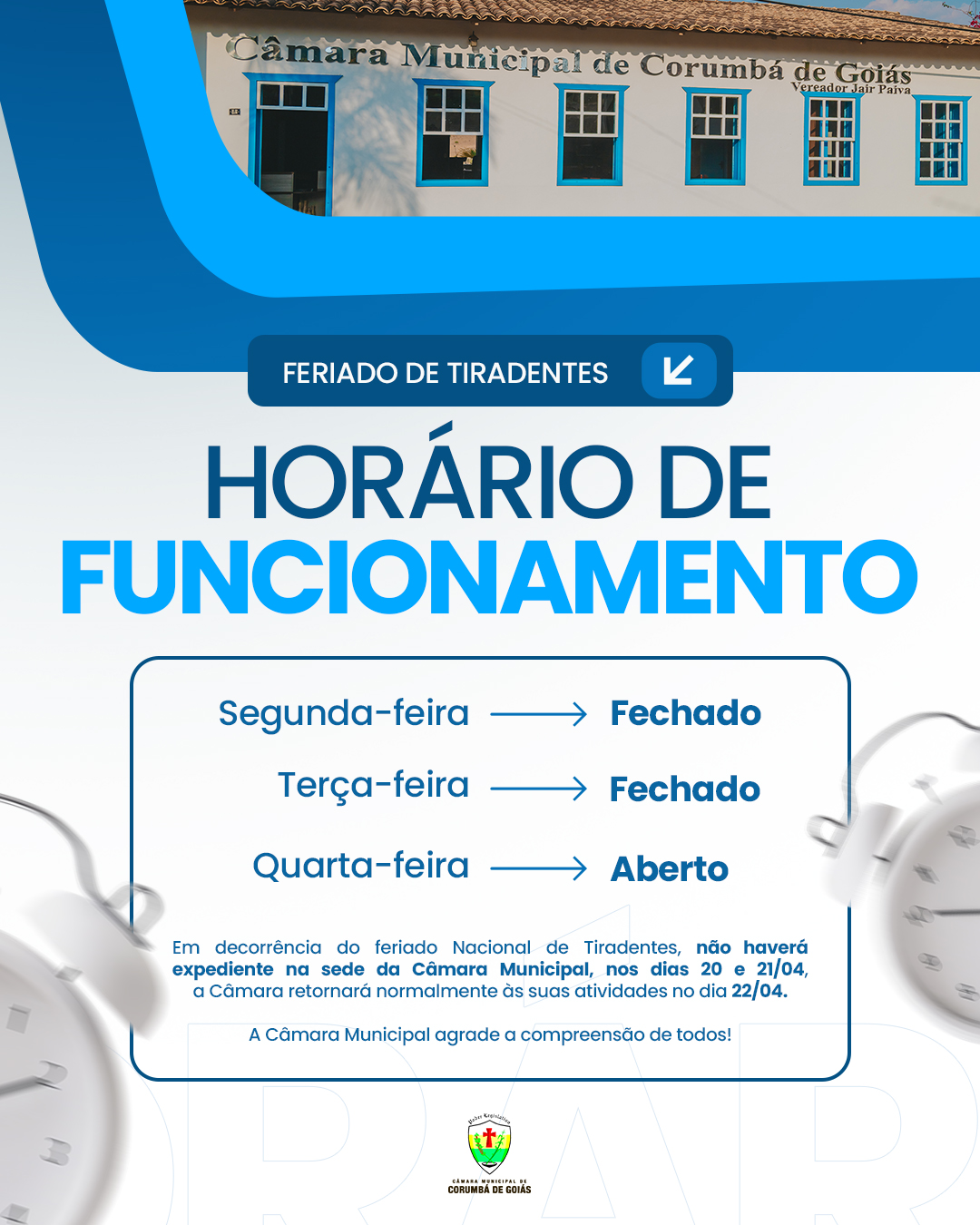 A Câmara Municipal de Corumbá de Goiás informa a toda a população o cronograma de funcionamento da nossa Sede para os próximos dias, conforme a Portaria nº 041/2026: