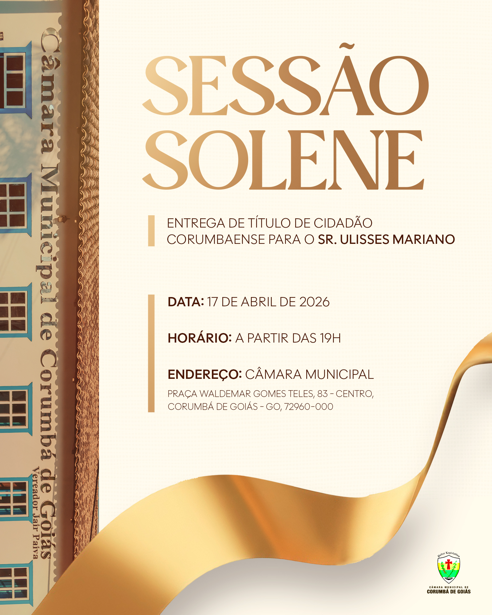 A Câmara Municipal de Corumbá de Goiás tem a honra de convidar você para um momento muito especial. No dia 17 de abril de 2026, a Câmara realizará uma Sessão Solene para a entrega do Título de Cidadão Corumbaense ao Excelentíssimo Sr. Ulisses Mariano.