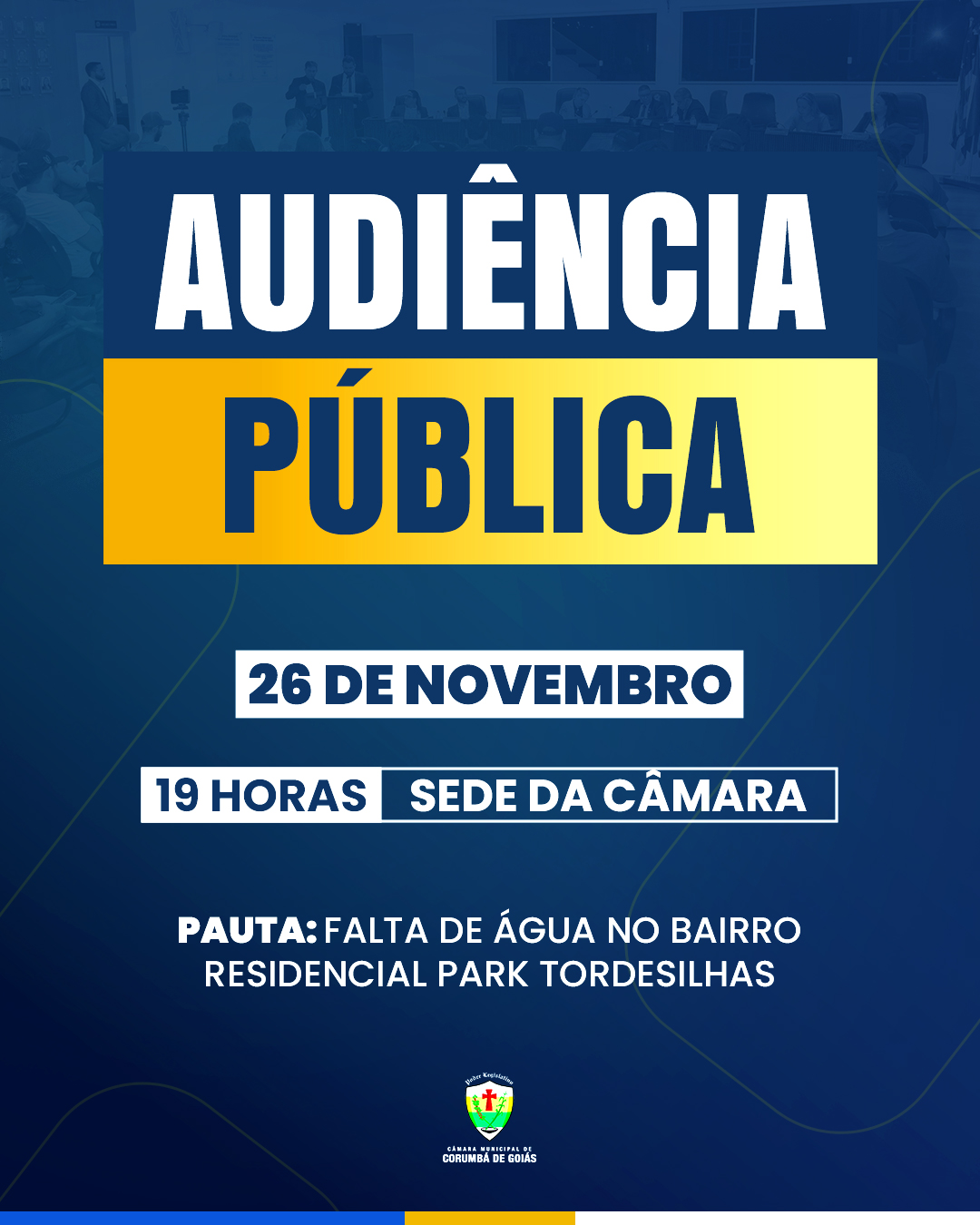 A Câmara Municipal de Corumbá de Goiás convida toda a população para participar da Audiência Pública que será realizada no dia 26 de novembro de 2025, às 19 horas, no plenário da Casa de Leis.
