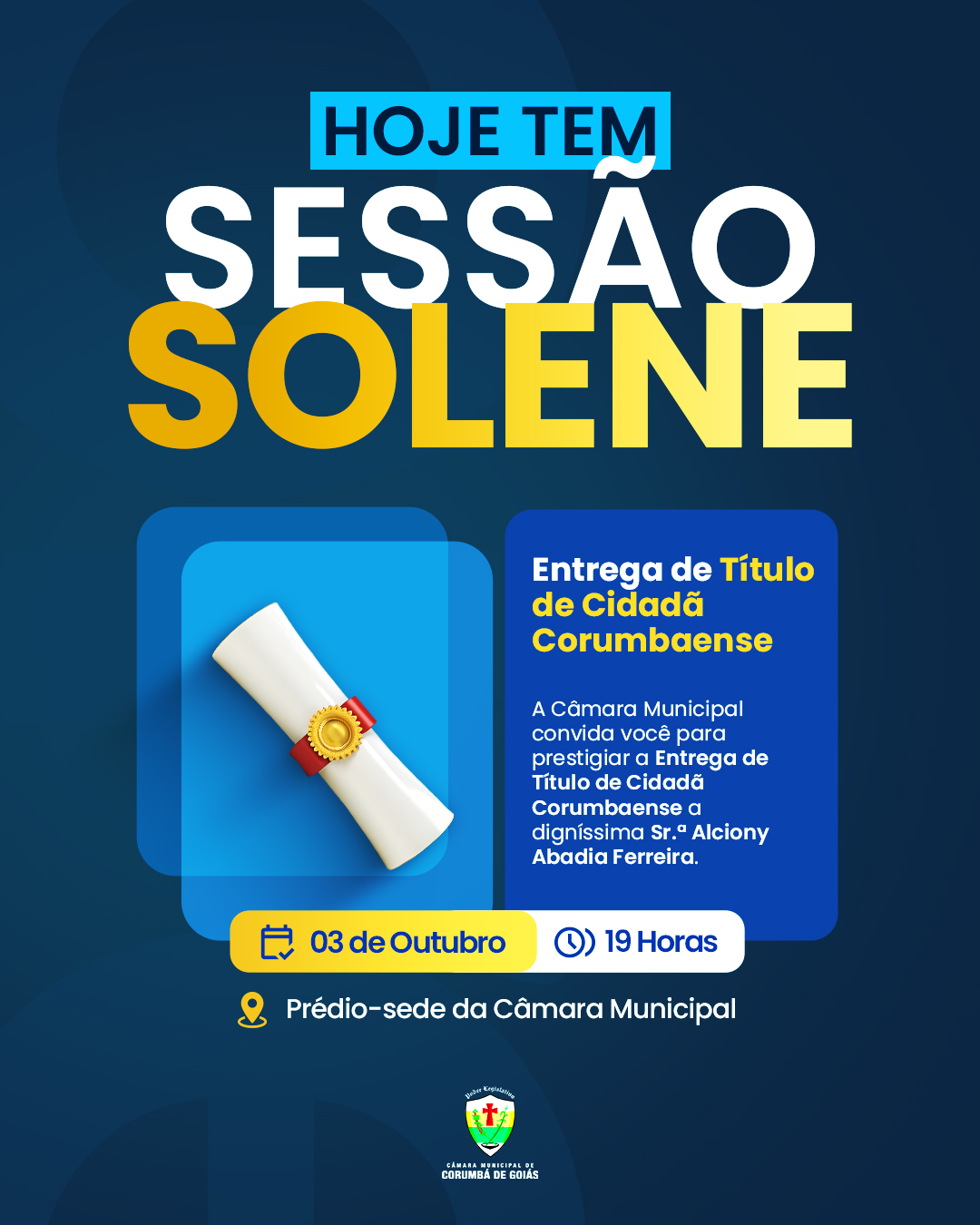 A Câmara Municipal de Corumbá tem a honra de celebrar, nesta data, a entrega do Título de Cidadã Corumbaense à Srª. Alciony Abadia Ferreira. A cerimônia ocorrerá às 19h, no Plenário da Câmara Municipal de Corumbá.