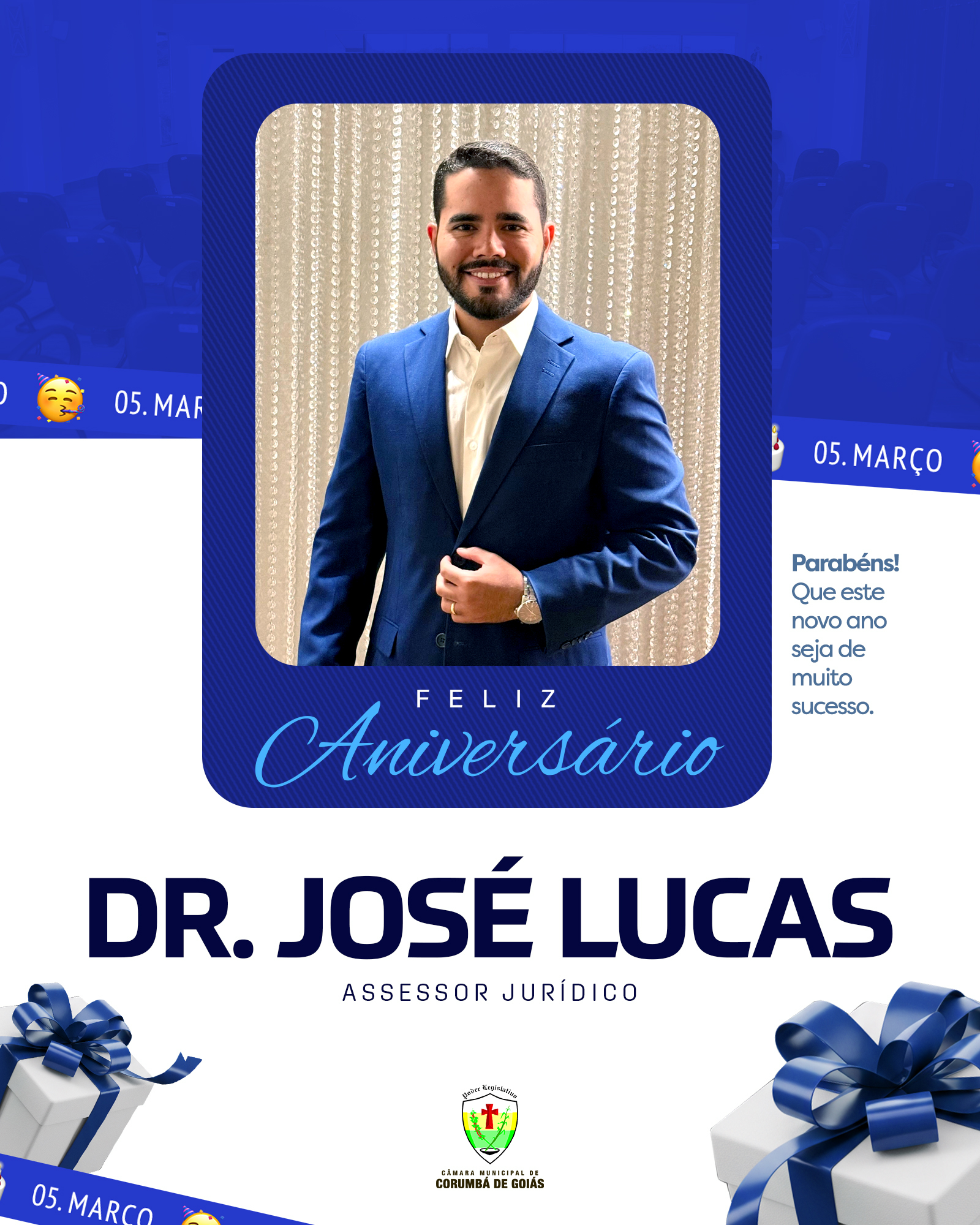 Hoje, 05 de março, a Câmara Municipal de Corumbá de Goiás celebra o aniversário do nosso Assessor Jurídico, Dr. José Lucas. Em nome de todos os vereadores e servidores da Casa de Leis, prestamos esta justa homenagem por mais este ciclo que se inicia.