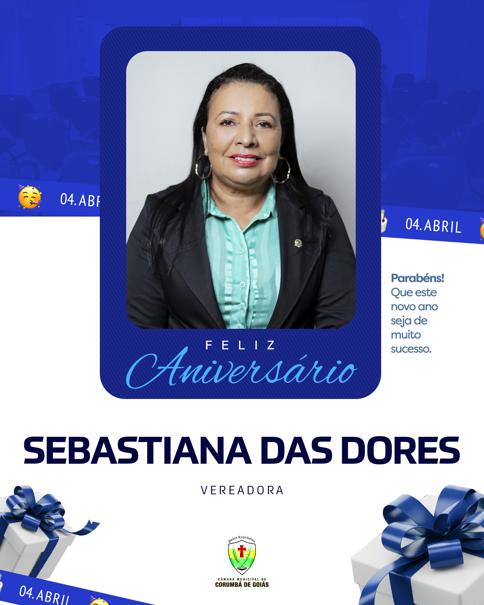 Hoje, 04 de abril, a Câmara Municipal de Corumbá de Goiás celebra o aniversário da vereadora Sebastiana das Dores, mais conhecida como “Tânia da Saúde”.