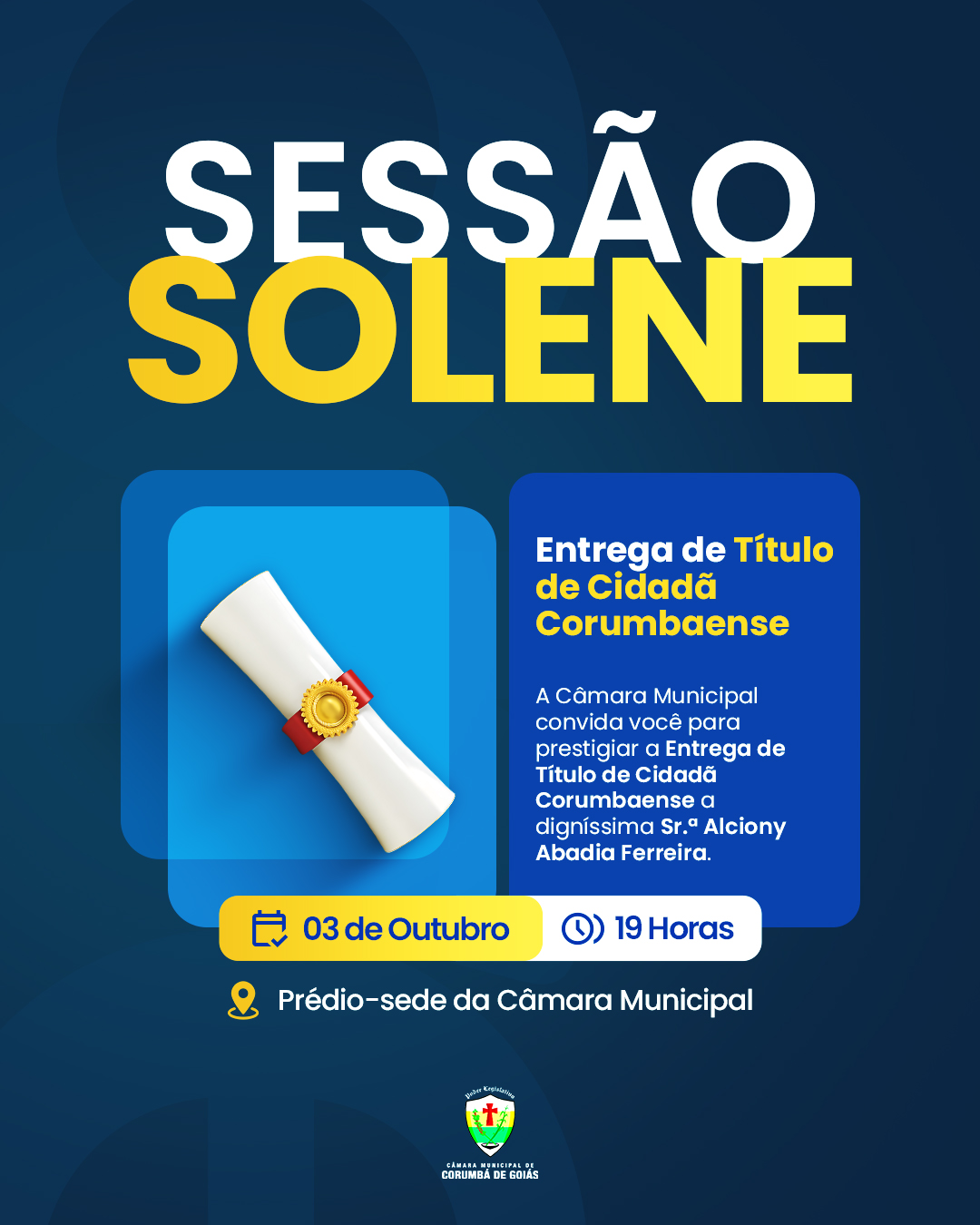 A Câmara Municipal de Corumbá tem a honra de convidar para a Sessão Solene em homenagem à Srª. Alciony Abadia Ferreira, ocasião em que será realizada a entrega do Título de Cidadã Corumbaense. Esta se realizará no dia 03 de outubro de 2025, às 19h, no Plenário da Câmara Municipal de Corumbá.