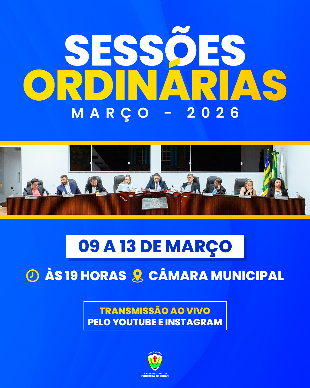 A Câmara Municipal de Corumbá de Goiás convida toda a população para acompanhar a nossa Semana de Sessões Ordinárias, que acontece de 09 a 13 de março.