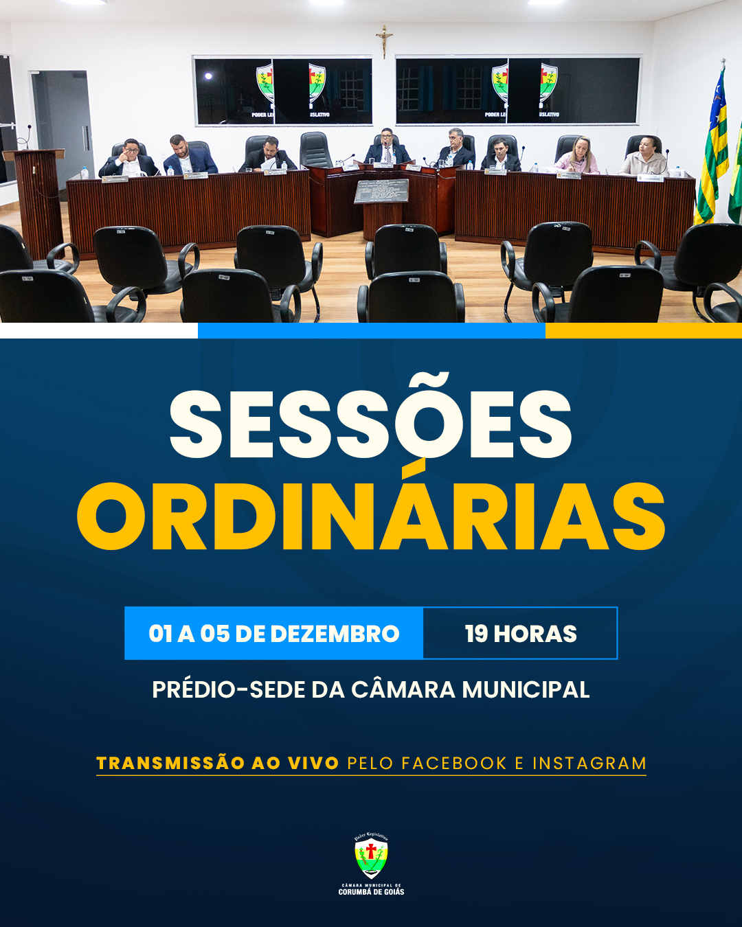 A Câmara Municipal de Corumbá de Goiás convida toda a população para acompanhar as últimas Sessões Ordinárias de 2025, que acontecerão entre os dias 01 e 05 de dezembro, sempre às 19 horas, no prédio-sede da Câmara.